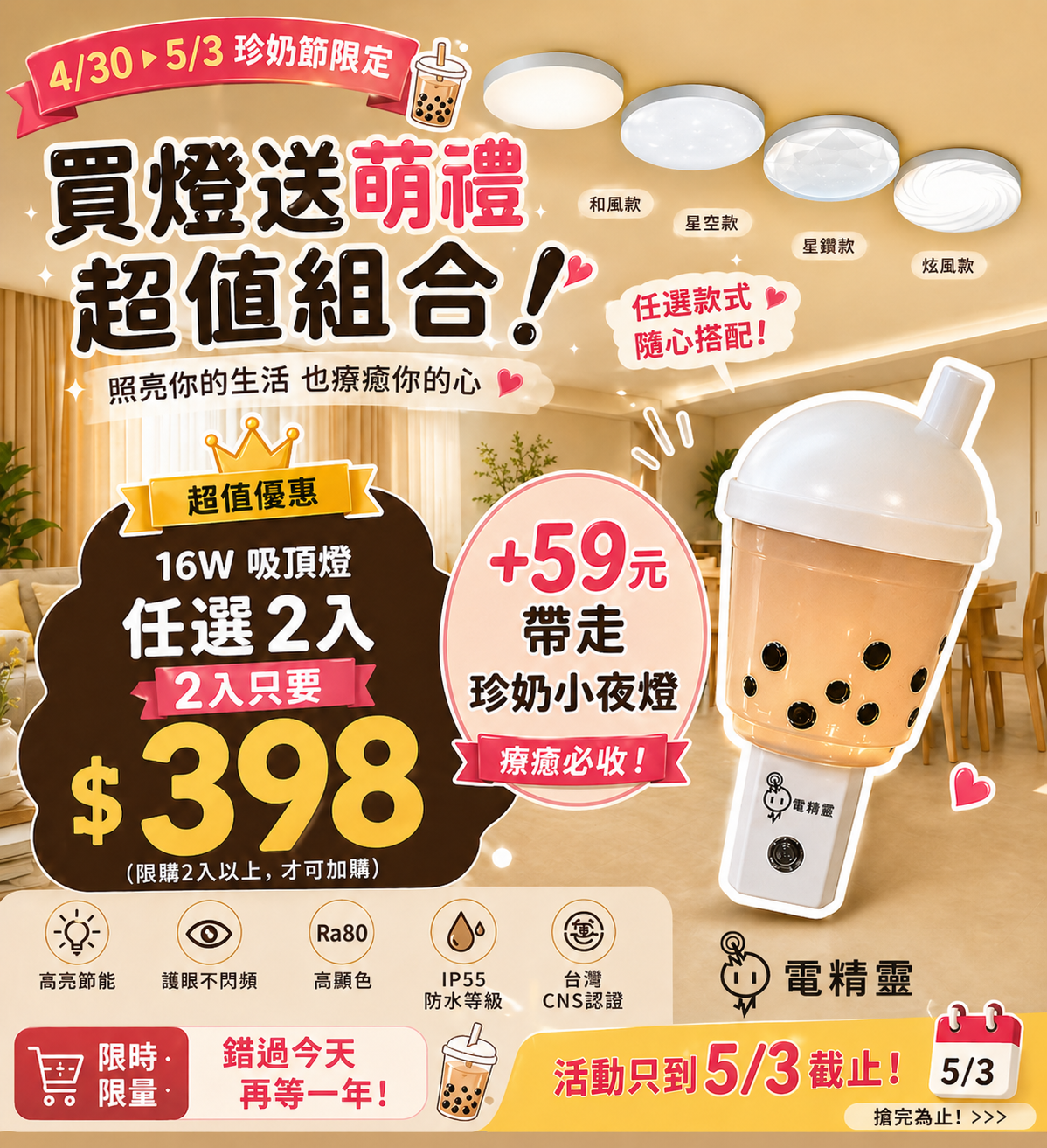 商品詳情 🔥 珍奶節限定活動說明✔ 任選2入吸頂燈 → $398✔ 可加購珍奶小夜燈 +59元⚠️ 每筆訂單「限加購1個」珍奶燈⚠️ 需達2入吸頂燈才可加購⚠️ 活動期間:4/30~5/3👉 數量有限,錯過等明年